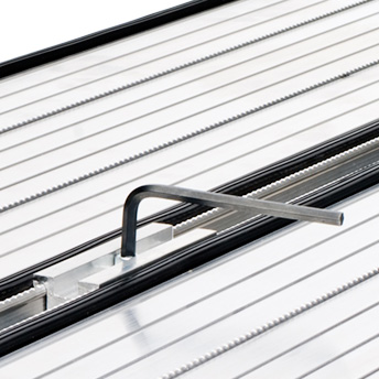 - Tighten clamps with allen key provided, ensuring top and bottom curved clamp jaws are engaged with the planks’ corner ribs.