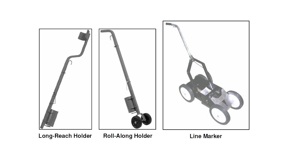 Use of these holders avoids the need to bend over when spraying on the ground. The long-Reach Holder assists in getting to those hard-to-reach areas. The Roll-Along Holder enables marking out straighter lines when required.